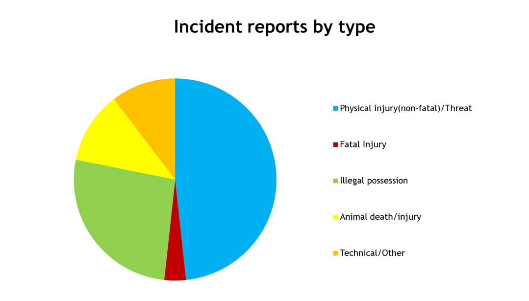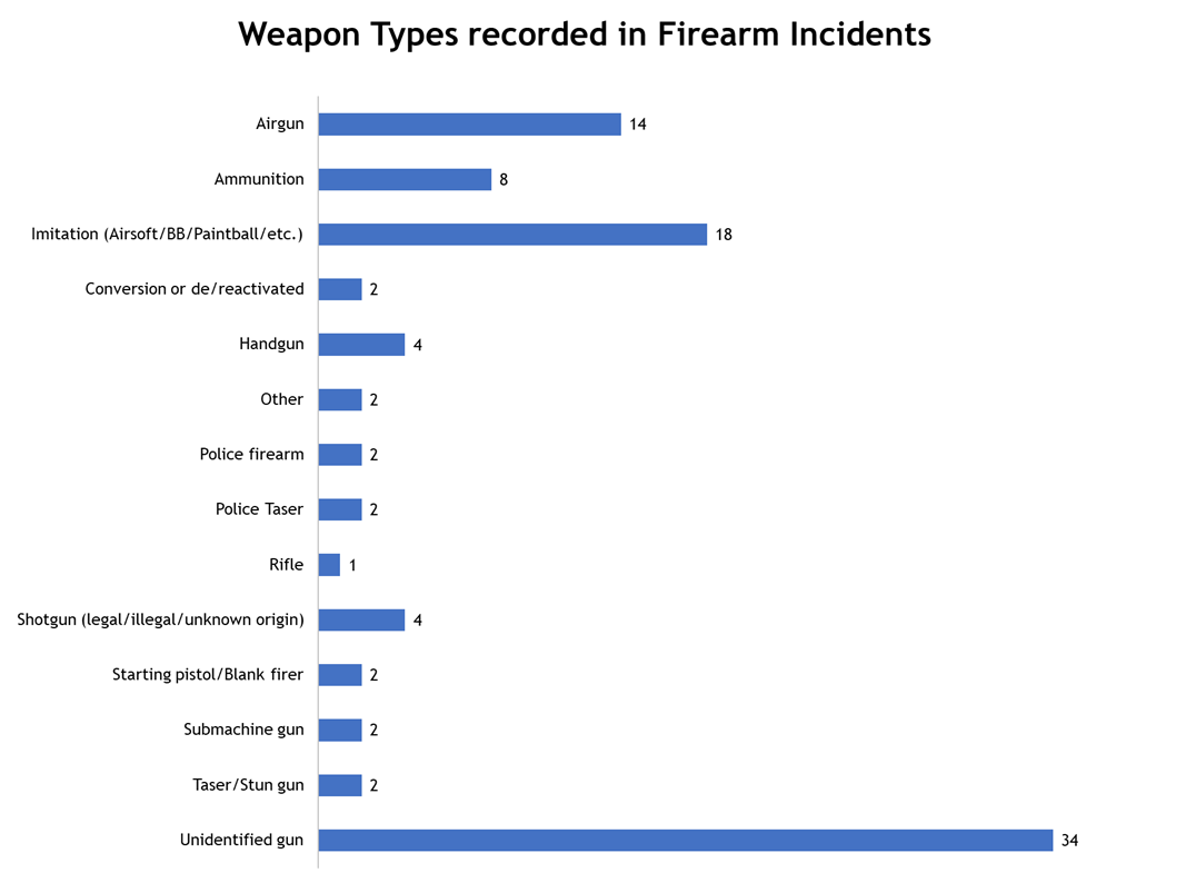 Many incidents involve the use of airguns*, Airsoft, imitation and BB guns, which do not require a licence and may not contain ammunition but are used by perpetrators to capitalise on the fear of victims who believe they are about to be shot. Traumatised victims are often unable to identify the weapons used. It is extremely difficult to distinguish between imitation and live-firing guns unless the weapons are fired and/or recovered, and, for this reason, guns involved in incidents frequently remain unidentified.