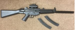 British legislation still permits the buying, selling and ownership of semi-automatic shotguns and .22 calibre semi-automatic rifles, styled as military-assault rifles.   Both of the firearms pictured below, on the left a semi-automatic Hatsan Arms ‘Escort Raider’ 12-gauge shotgun and, on the right, a .22 calibre GSG-5 22LR semi-automatic rifle, are legally available to buy, sell and own in Britain today.