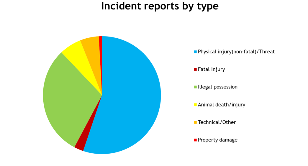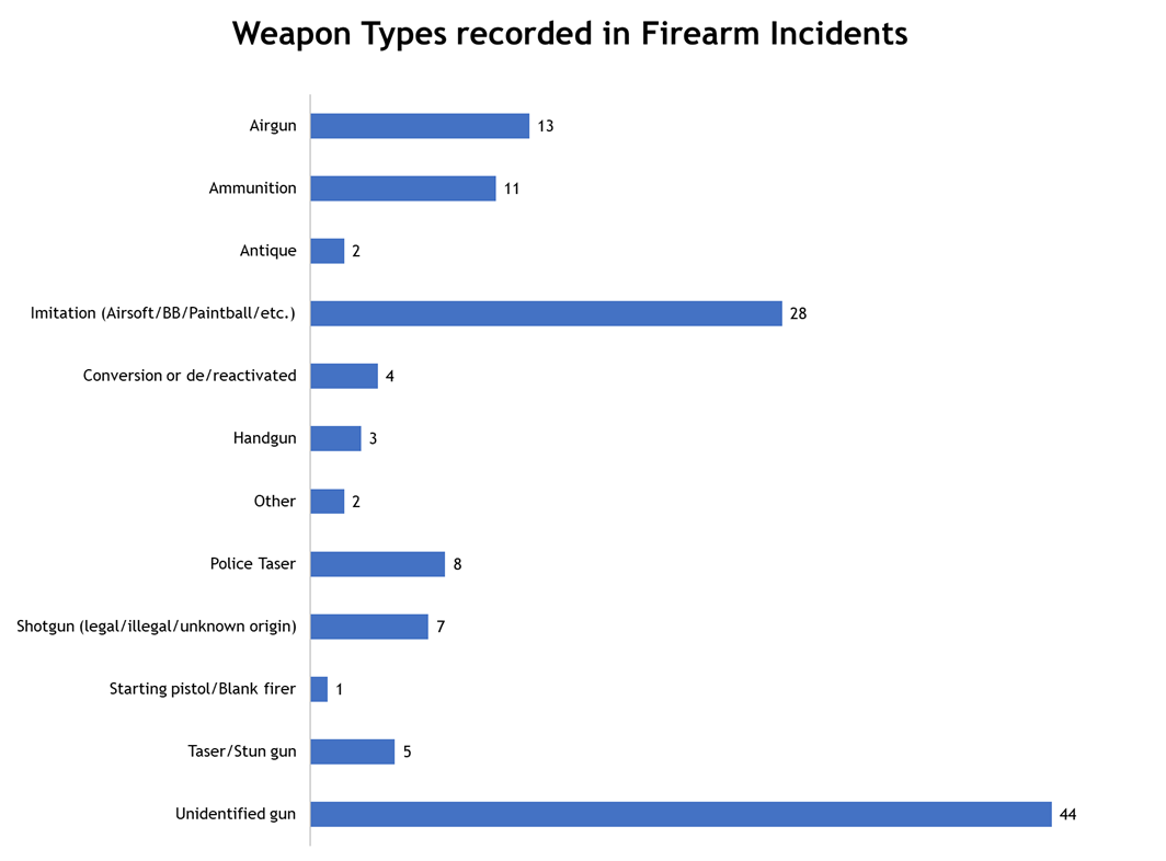 Many incidents involve the use of airguns*, Airsoft, imitation and BB guns, which do not require a licence and may not contain ammunition but are used by perpetrators to capitalise on the fear of victims who believe they are about to be shot. Traumatised victims are often unable to identify the weapons used. It is extremely difficult to distinguish between imitation and live-firing guns unless the weapons are fired and/or recovered, and, for this reason, guns involved in incidents frequently remain unidentified.