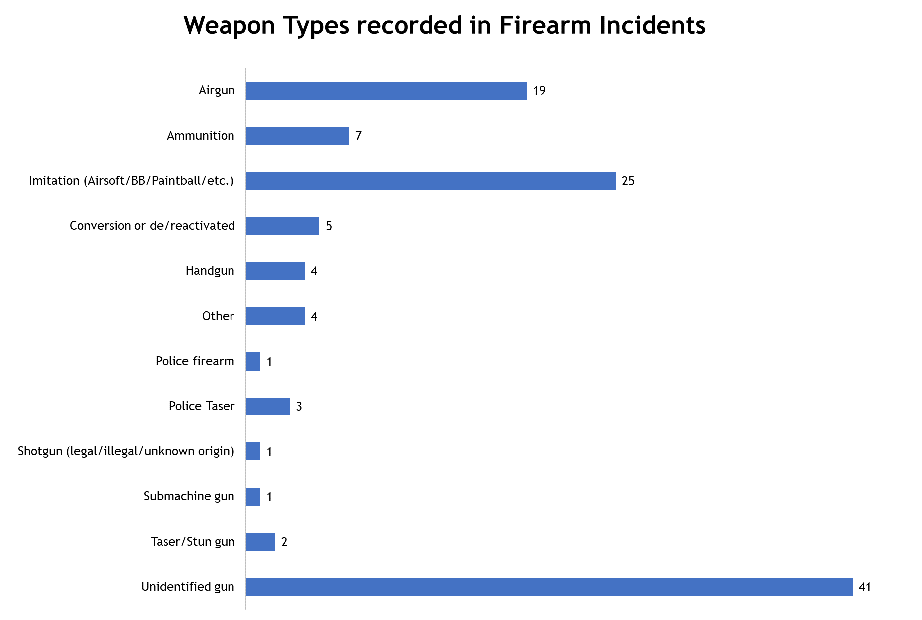 Many incidents involve the use of airguns*, Airsoft, imitation and BB guns, which do not require a licence and may not contain ammunition but are used by perpetrators to capitalise on the fear of victims who believe they are about to be shot. Traumatised victims are often unable to identify the weapons used. It is extremely difficult to distinguish between imitation and live-firing guns unless the weapons are fired and/or recovered, and, for this reason, guns involved in incidents frequently remain unidentified.