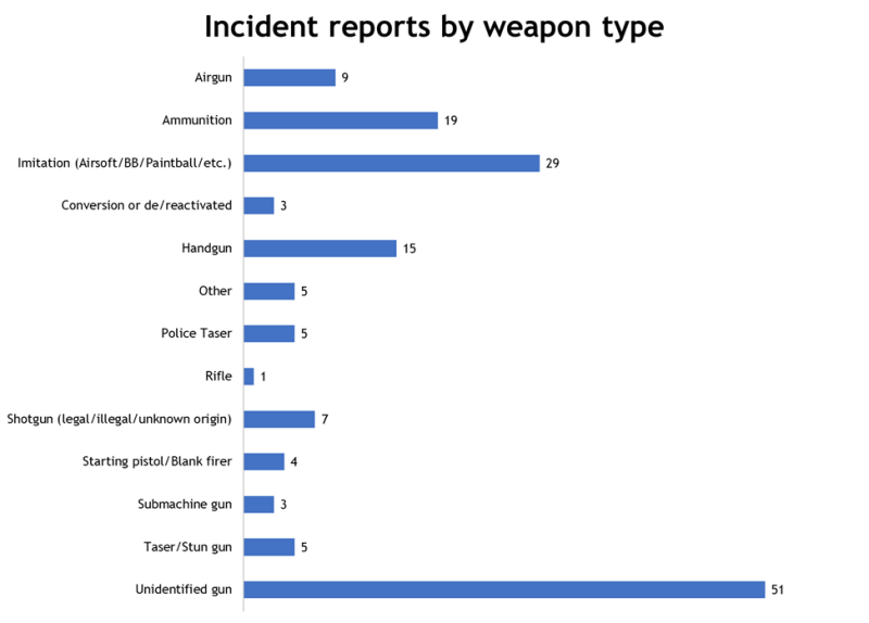 Many incidents involve the use of airguns*, Airsoft, imitation and BB guns, which do not require a licence and may not contain ammunition but are used by perpetrators to capitalise on the fear of victims who believe they are about to be shot. Traumatised victims are often unable to identify the weapons used. It is extremely difficult to distinguish between imitation and live-firing guns unless the weapons are fired and/or recovered, and, for this reason, guns involved in incidents frequently remain unidentified.