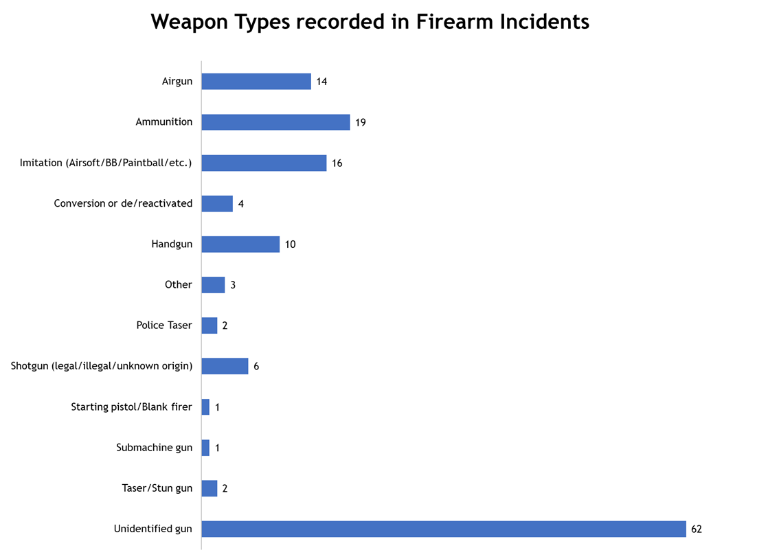 Many incidents involve the use of airguns*, Airsoft, imitation and BB guns, which do not require a licence and may not contain ammunition but are used by perpetrators to capitalise on the fear of victims who believe they are about to be shot. Traumatised victims are often unable to identify the weapons used. It is extremely difficult to distinguish between imitation and live-firing guns unless the weapons are fired and/or recovered, and, for this reason, guns involved in incidents frequently remain unidentified.