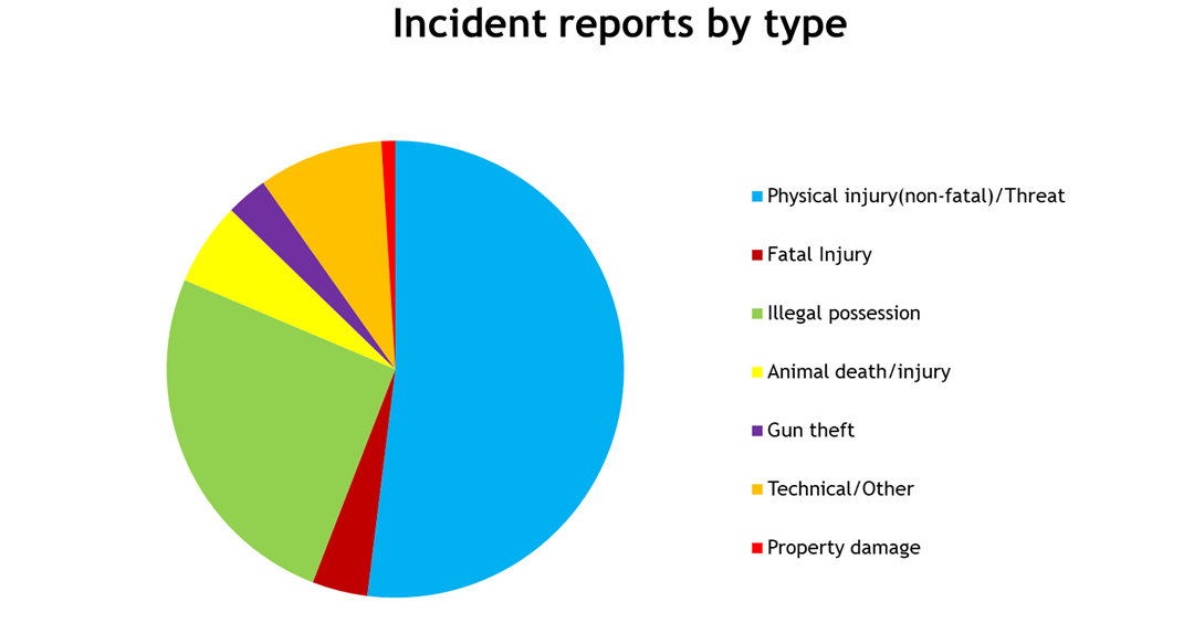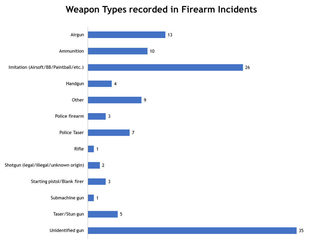 Many incidents involve the use of airguns*, Airsoft, imitation and BB guns, which do not require a licence and may not contain ammunition but are used by perpetrators to capitalise on the fear of victims who believe they are about to be shot. Traumatised victims are often unable to identify the weapons used. It is extremely difficult to distinguish between imitation and live-firing guns unless the weapons are fired and/or recovered, and, for this reason, guns involved in incidents frequently remain unidentified.