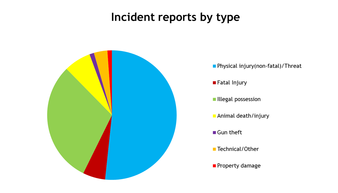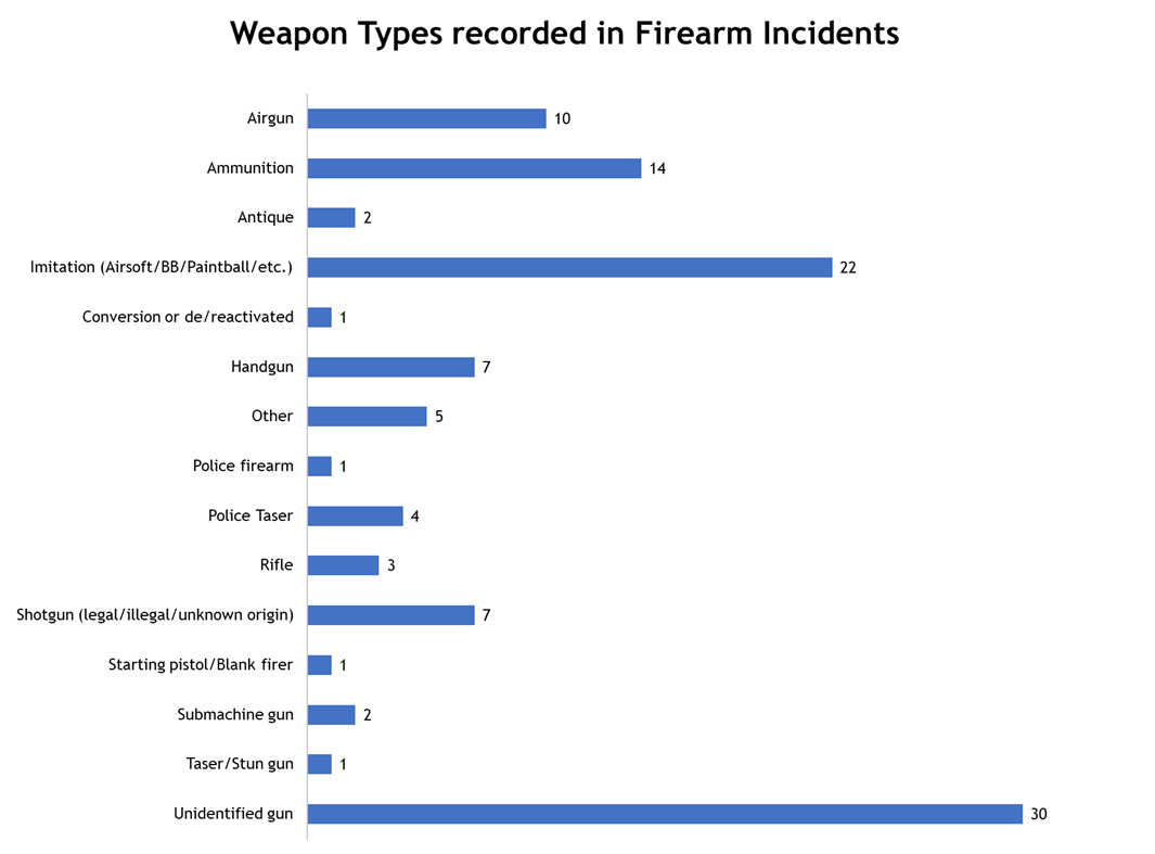 Many incidents involve the use of airguns*, Airsoft, imitation and BB guns, which do not require a licence and may not contain ammunition but are used by perpetrators to capitalise on the fear of victims who believe they are about to be shot. Traumatised victims are often unable to identify the weapons used. It is extremely difficult to distinguish between imitation and live-firing guns unless the weapons are fired and/or recovered, and, for this reason, guns involved in incidents frequently remain unidentified.